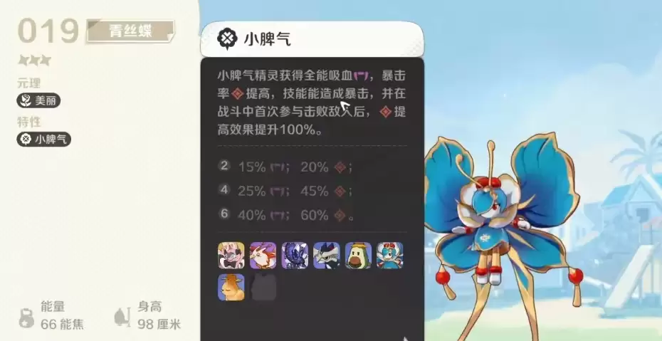 当然,恢复的是能量方面的数据,基础是20点能量恢复,如果触发效果得到提升的话,主要体现在触发这个回复的概率上,而非回复的百分比比例。最高触发概率基本达到了50%,所以一半一半的几率可以使其整体生存能力得到足够的提升。另外,它在特性上属于小脾氣类型的特性,凡是带有此类特性的精灵,其实在战场上都会获得一定的吸血恢复效果,而且在暴击率上也会得到百分比的提升。使用技能进行输出时,也会有更大的概率造成暴击,且此类特性带来的击败效果可以在战斗中让玩家首次参与击败敌人之后,还会带来100%的暴击率提升效果。因此,这个提升效果其实属于偏全能型的能力。