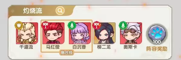 第二个流派是灼烧流,可选择千道流、马红俊、白沉香、柳二龙、奥斯卡。主C为奥斯卡,其中马红俊和白沉香能够使用融合技能。在这个组合中,可以优先升级马红俊的凤凰啸天机与柳二龙的火龙真身。对于平民玩家而言,选择这个组合会有相当不错的表现,真正实现低成本、高效率的作战效果。