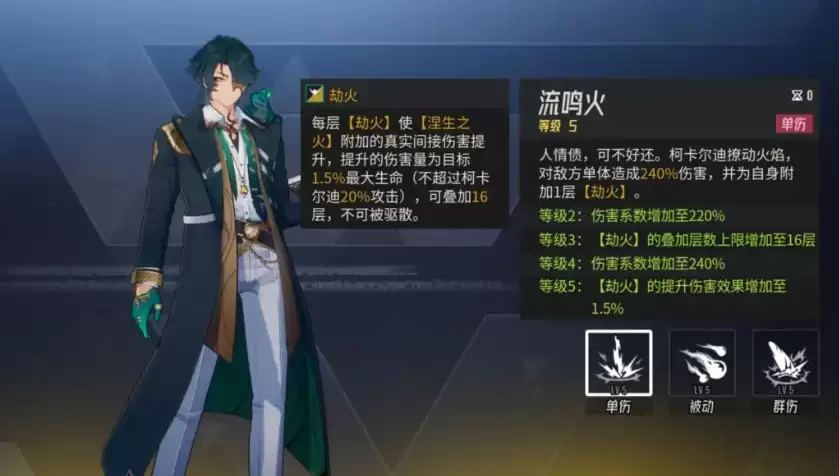 柯卡尔在游戏中的设定是海拉德银行的经理之首,是一位实权人物。在剧情里他拥有不少特权,而且技能配置也颇具特色。他的普攻“流鸣火”发动时会附加火焰属性伤害,集中对单一目标造成240%的高额输出,并同时为自身叠加一层“劫火”状态。这个特殊的“劫火”效果,其实正是柯卡尔的专属机制——涅槃之火。每层可为攻击提升相当于目标生命值1.5%的真实伤害,最高不超过柯卡尔攻击力的20%。该效果最多可叠加16层,且他的一项被动能力“无法被驱散”更是进一步强化了自身生存力。简单来说,只要场上还存在友方单位,柯卡尔就无法被敌方选为攻击目标,这让他能够在战斗中保持较好的持续输出环境。