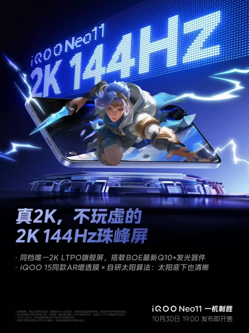 近日,iQOO官方正式宣布,备受瞩目的新一代旗舰机型iQOO Neo11将于10月30日19:00正式发布并同步开售。自曝光以来,这款新机就引发了广泛关注,其核心亮点之一是搭载了同价位段顶级的2K+144Hz珠峰屏,成为该档位屏幕成本最高的机型之一。
