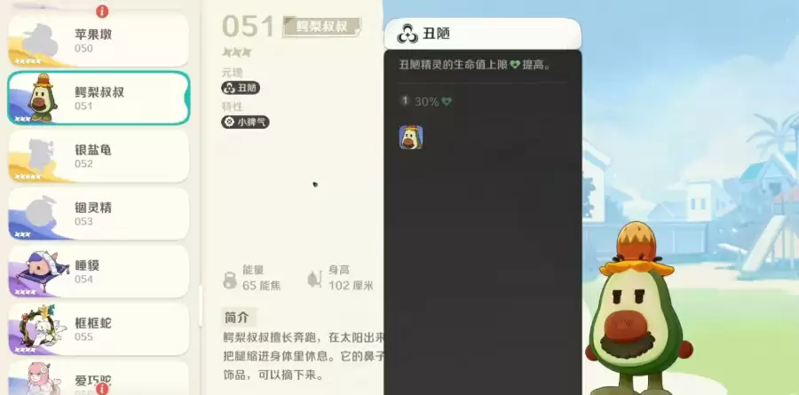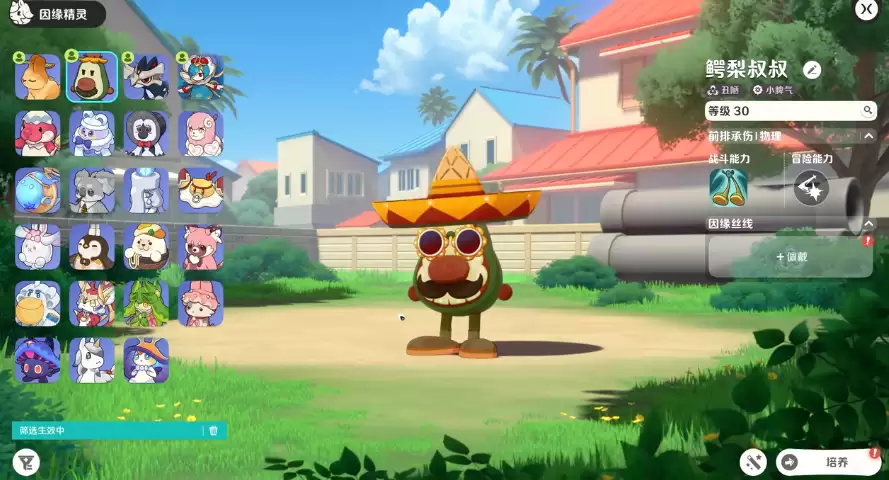 鳄梨叔叔的特性是“小脾气”。根据这个特性,大家其实有很多精灵可以选择,目前“小脾气”类型里面一共有8种宠物可供搭配。通过这些特性触发羁绊后,能获得相当不错的效果。具体来说,当“小脾气”精灵上场之后,会获得“全能吸血”的基础效果。进入吸血状态之后,还会增加一定的暴击率提升概率。如果在战斗中触发了这个“小脾气”的羁绊,并且您是第一个击败敌人的,还会有额外战果加成。换言之,首次击败敌人时获得的收益是最高的。由于这个原理比较独特,它在队伍搭配上其实相当自由,大家只需要考虑它的“小脾气”特性即可。这是一个相对简单的触发条件,触发的羁绊效果也是非常显著的。