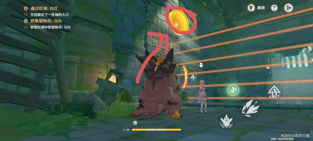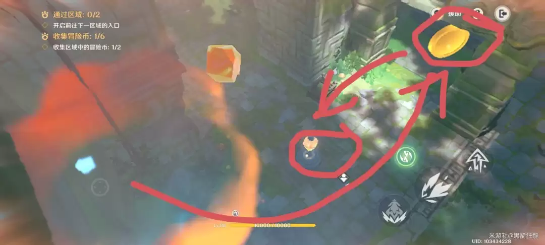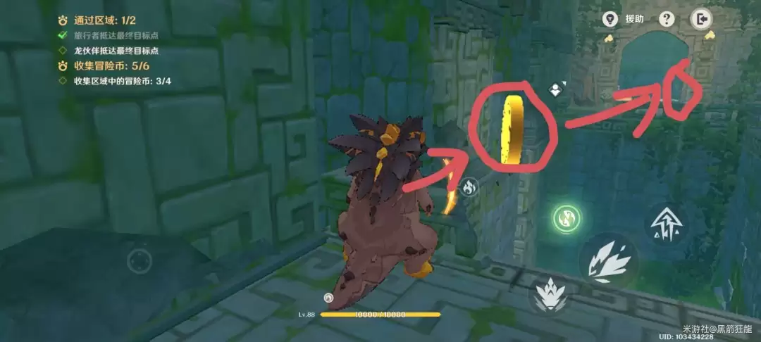 通关技巧:切换为龙形态攀上墙体,获取第一枚金币。