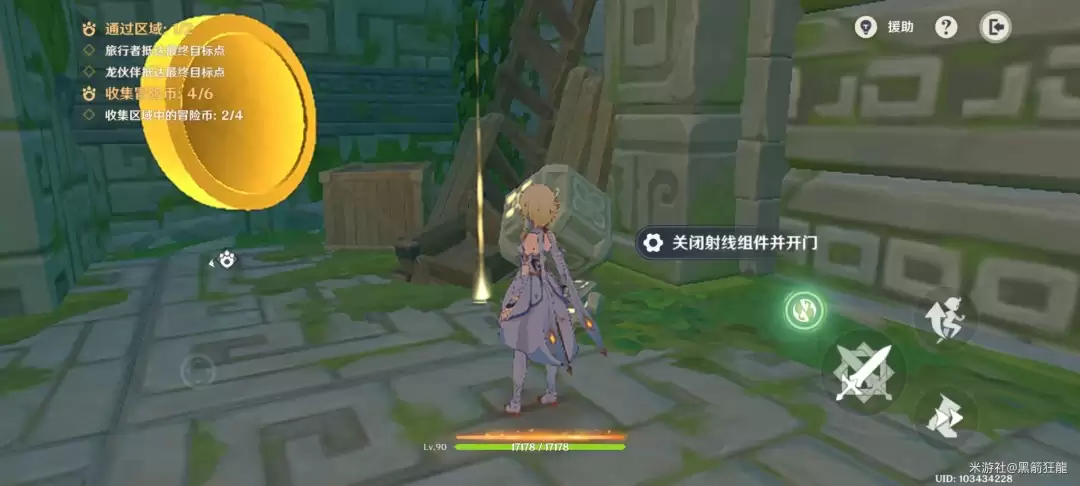 切回旅行者,关闭射线组件并开启通道门,获取旁边的第五枚金币。