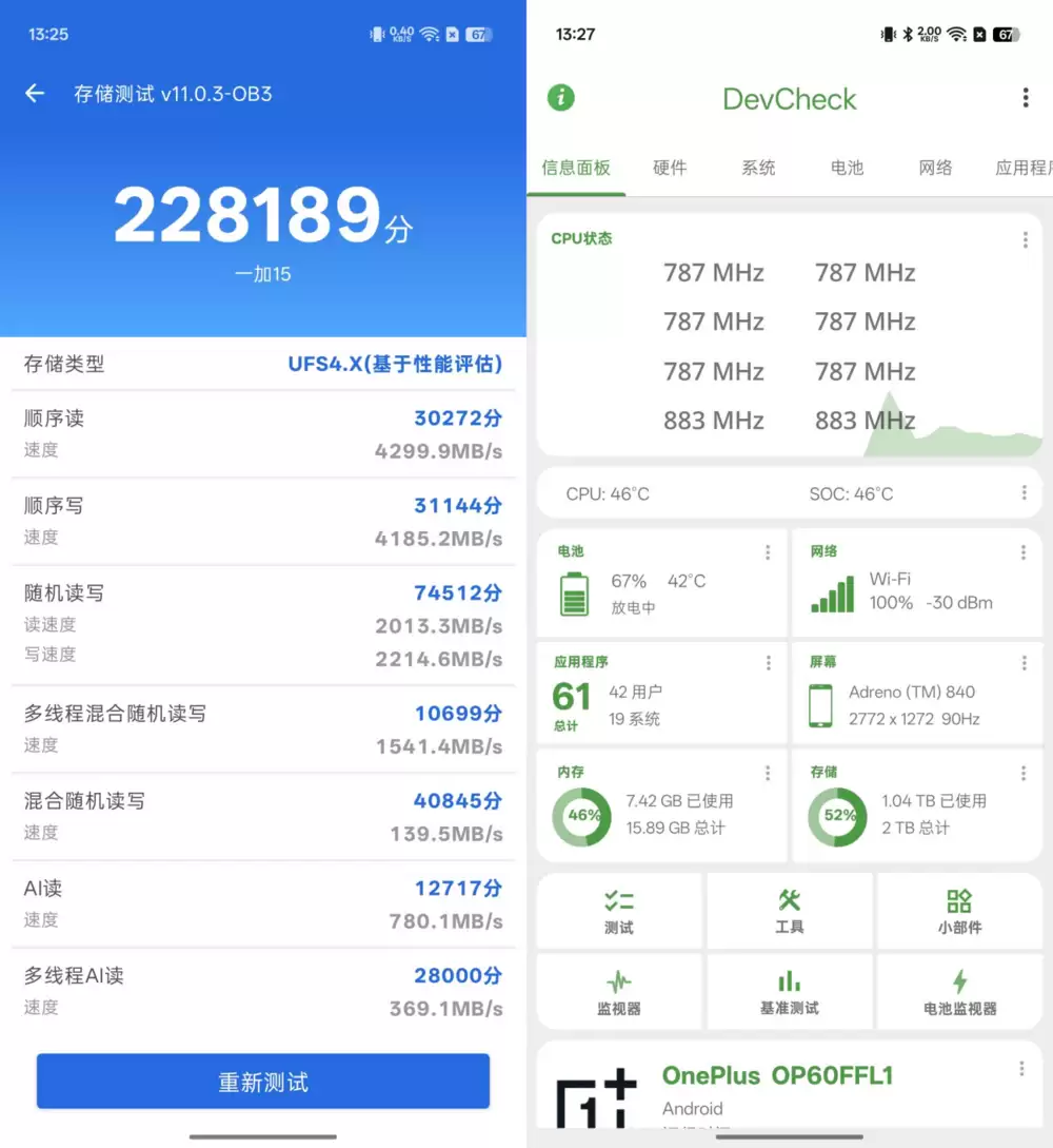 一加15的性能体系以硬件旗舰级+优化芯片级为核心,通过第五代骁龙8至尊版移动平台+顶级存储组合+自研技术的深度协同,将性能转化为全程满帧体验。一加15搭载LPDDR5X Ultra内存+UFS 4.1闪存的旗舰级存储组合,可以看出它的闪存性能读写全部突破4.2GB/S。