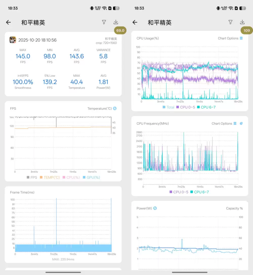 而一加15在和平精英上的表现为平均帧143.6fps,5%low帧为139.2fps,整机温度为40℃。