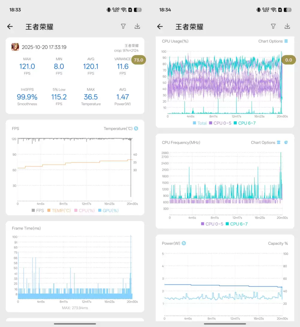 具体在游戏方面的表现就是,一加15在王者荣耀方面,平均帧可以达到120.1fps,而5% low帧为115.2fps,整机温度为38℃。