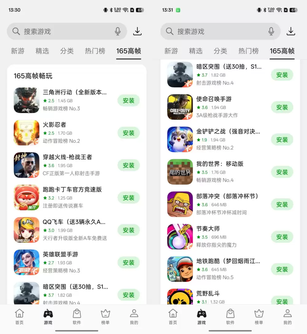 说到这个165Hz的体验,目前一加的应用商城里面已经带来了165Hz专区,热门游戏已经适配了这个模式。