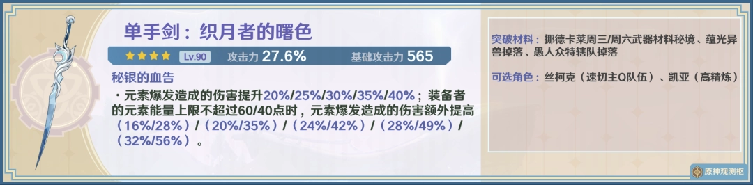 3.2.凯亚:织月者的曙色相较于精5海渊终曲的提升幅度,视织月者精炼等级及海渊特效触发情况,约在5%至15%之间,与同精炼狼牙(在卢凯万队伍中)表现接近或略低。不过,精5满血的黎明神剑需要一定精炼才能开始获得提升,加上部分队伍还需优先携带西风剑,因此织月者虽可作为备选,但整体性价比并不突出。