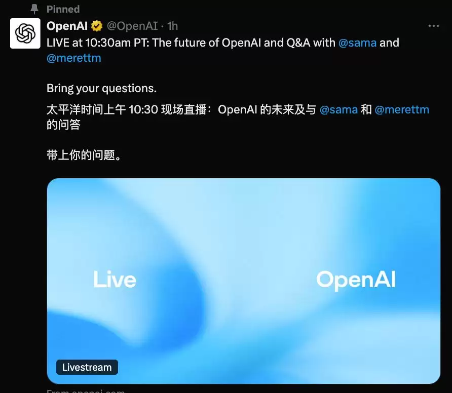 太平洋时间10月28日上午10:30(北京时间10月29日凌晨1:30),山姆·奥特曼与OpenAI首席科学家Jakub Pachocki还将通过直播解答关于“OpenAI未来规划”的提问。