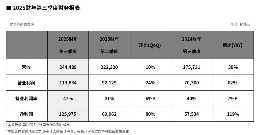 10月29日,SK海力士发布了截至2025年9月30日的2025财年第三季度财务报告。财报显示,公司第三季度实现营业收入24.448万亿韩元(约合1209.49亿元人民币),较去年同期增长39%;营业利润达到11.383万亿韩元(约合563.14亿元人民币),同比增长62%;净利润录得12.597万亿韩元(约合623.2亿元人民币),同比大幅增长119%。值得注意的是,公司第三季度营业利润率为47%,净利润率更是高达52%。