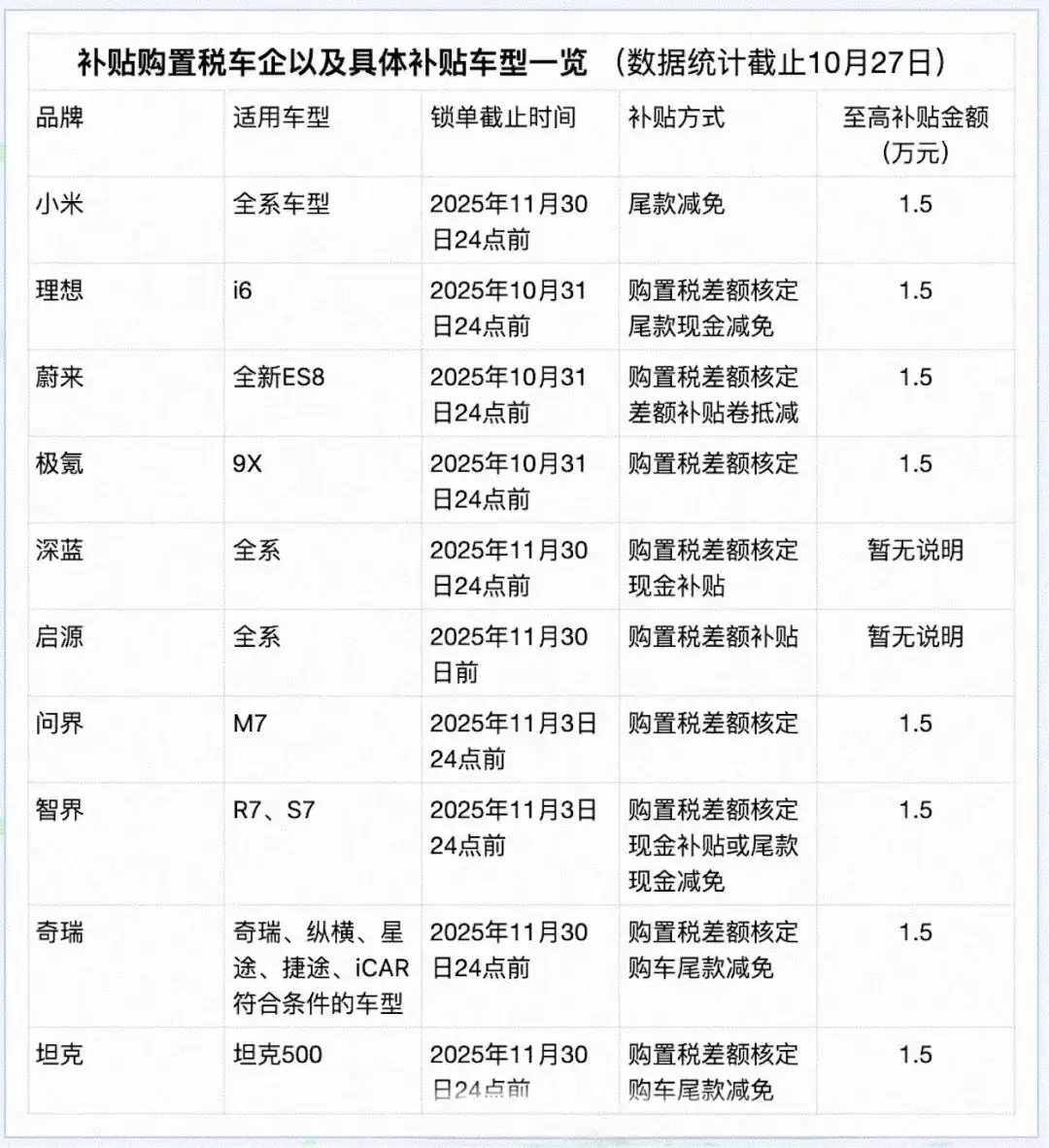 如因最新原因,2025年完成锁单的订单需在2026年开票交付,消费者可使用购置税差额补贴券抵扣车价,最高可抵扣1.5万元。