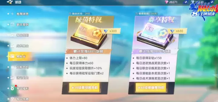 特权卡:激活“绿茵特权”(30元续费),可享体力上限+80、每日领60体力、玩家经验+10%等增益;激活“尊享特权”(68元续费),则能每日领150彩钻、增加副本奖励次数。两个特权分别剩余29天、59天有效期。