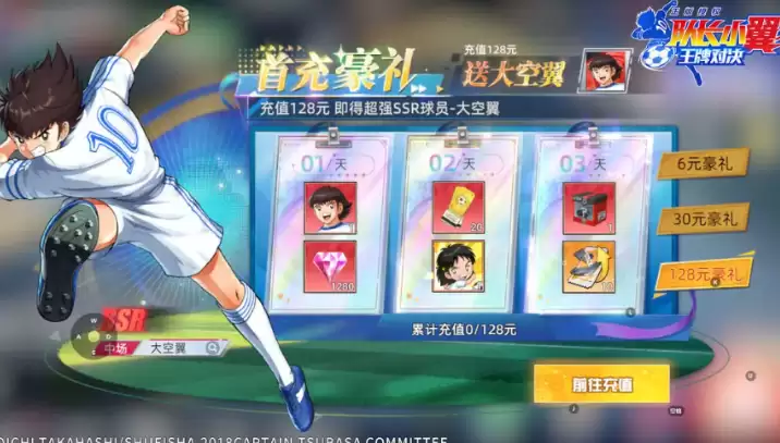 2. 首充福利:三档档位可选,128元直接抱走SSR大空翼