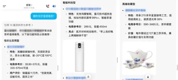 接着,小编尝试输入“哪种茶杯值得入手”。豆包迅速整理出一份精选清单,并贴心地按照“高性价比实用款”“智能科技型”以及“收藏级”三个类别进行划分,每个类别还推荐了两款优质产品。