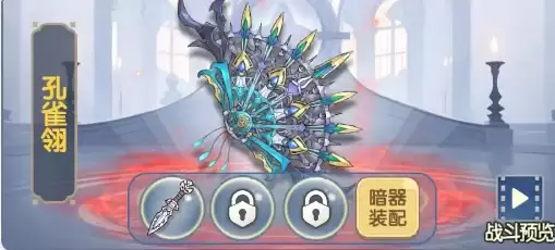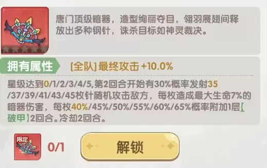 首先要介绍的是“孔雀翎”,这也是今天推荐的重点暗器之一。它可算是唐门暗器中最顶级的存在,外观精致华丽,档次感十足。其整体呈扇形结构,每次展开后,能迅速射出多枚钢针,对敌人造成穿透性伤害。攻击速度极快,若把它作为主战暗器,整个队伍的攻击力将直接提升10%。