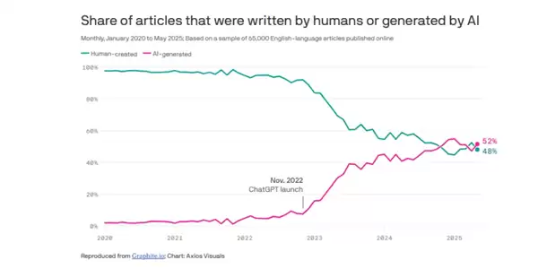 AI生成英文内容占比首超人类达52%,但增长势头趋缓
