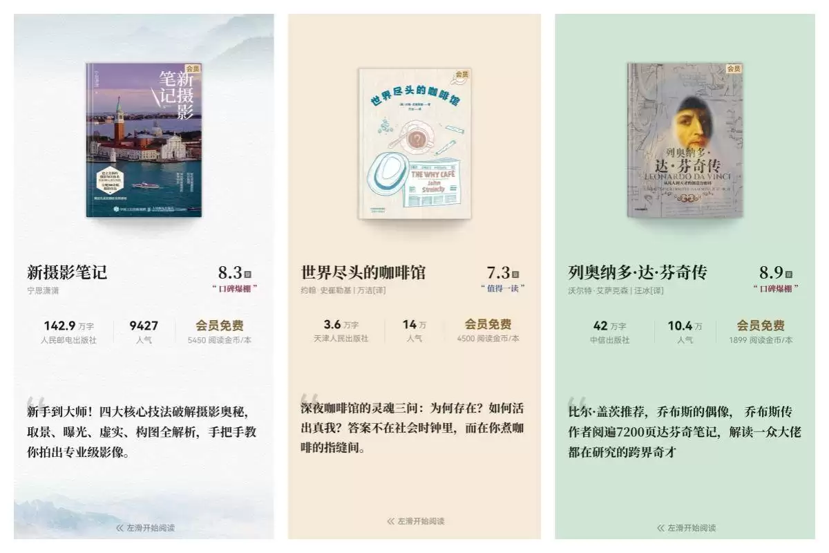 接下来即将共读的几本书籍,也值得读者们持续关注。《新摄影笔记》从作者的亲身拍摄经验出发,构建了一套完整的摄影教学体系,内容深入浅出,通俗易懂,特别适合摄影初学者和爱好者学习借鉴。《世界尽头的咖啡馆》则以充满哲思的笔触,提出深夜咖啡馆的灵魂三问,答案不在社会时钟里,而藏在每位读者烹煮咖啡的时光缝隙中。《列奥纳多·达·芬奇传》更是深受众多名人推崇的人物传记。这些精选书籍都是华为阅读VIP会员的免费阅读书单,非常适合与书友共同品读探讨,华为阅读为读者搭建了以书会友的交流平台,欢迎对这些书籍感兴趣的会员朋友踊跃报名参与。