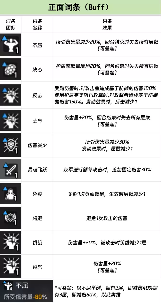 首先,正面词条中有两种机制值得关注。不屈能够让你在受到伤害时减少20%的伤害量,听起来像是个简单的防御提升,但需要注意它的持续时间并不长,每回合结束时所有层数都会清空。好在,这个词条的独特之处在于它允许叠加,只要在连续回合中不断获得新的不屈层数,你就能持续降低受到的伤害,在激烈的对抗中维持更高的生存能力。