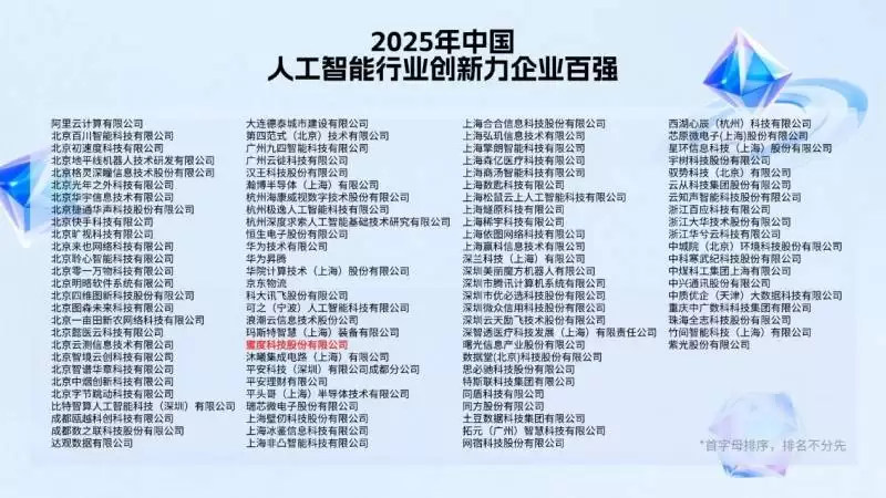 完整版的"2025年中国人工智能行业创新力企业百强"榜单显示,入选企业分布广泛,覆盖了云计算、半导体、智能装备、医疗科技等多个领域。北京地区的企业表现尤为突出,包括北京百川智能科技有限公司、北京地平线机器人技术研发有限公司等在内的多家企业上榜。上海地区也有不少企业入选,如滉博半导体(上海)有限公司、上海商汤智能科技有限公司等。