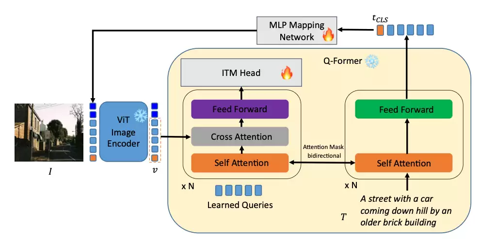 下图呈现了ELIP-B的训练示意图。与CLIP/SigLIP类似,MLP映射网络将文本特征投影到视觉特征空间。独特之处在于,由文本引导生成的图像特征会输入Q-Former模块与文本进行交叉注意力计算,最终通过ITM头部预测图文匹配程度。ELIP-B训练时采用BLIP-2的BCE损失函数。
