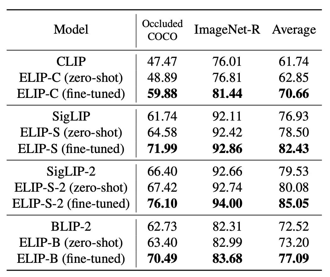 在分布外测试集上,ELIP系列模型均实现了零样本泛化能力的提升。若在对应领域进行微调——例如在COCO数据集上对遮挡COCO任务微调,在ImageNet数据集上对ImageNet-R任务微调,还能获得更显著的性能提升。这进一步表明ELIP方法不仅能增强预训练效果,还提供了一种高效的自适应机制。