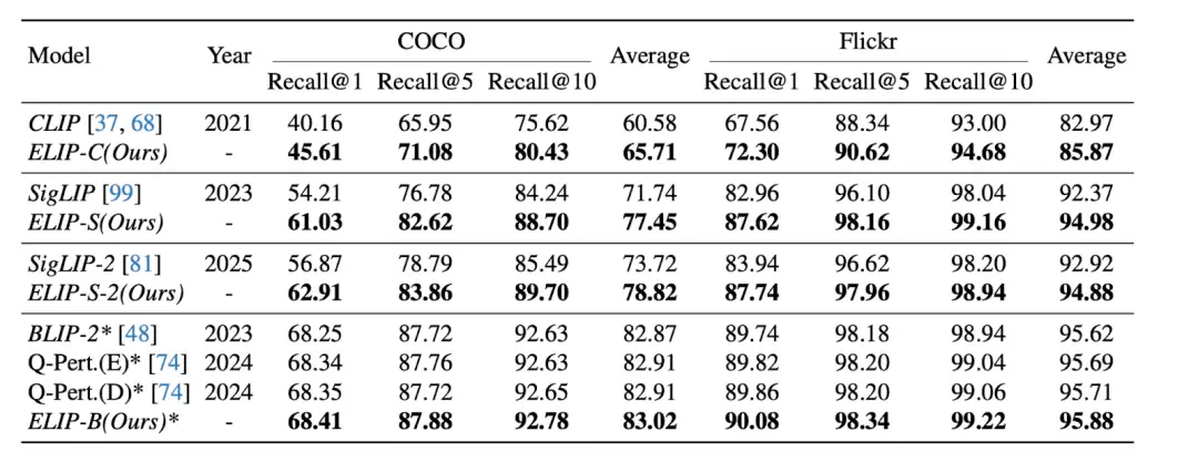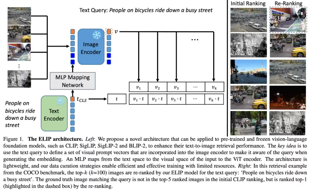 在重排阶段,研究团队设计了一个轻量级的MLP映射网络,将文本特征转化为视觉域的可感知标记。这些标记被注入图像编码器后,使得模型在编码视觉信息时能够同步感知语言语义。经过重新编码的图像特征与文本特征进行对比时,同一查询语句能获得更优化的排序结果。该方法可适配CLIP/SigLIP/SigLIP-2/BLIP-2等主流视觉语言模型,分别形成ELIP-C/ELIP-S/ELIP-S-2/ELIP-B等变体。