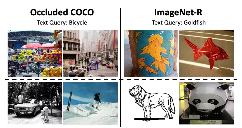 除在COCO、Flickr等标准测试集上进行评估外,研究团队还提出了两个新的分布外测试集:遮挡COCO和ImageNet-R。