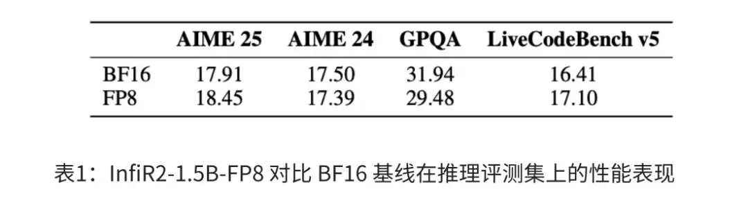 △ InfiR2-1.5B-FP8 对⽐ BF16 基线在推理评测集上的性能表现,两者几乎持平。图源:企业供图
