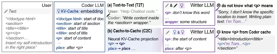 a) T2T 通过显式文本生成传递信息 b) C2C 直接将不同模型的 KV-Cache 进行投影与融合