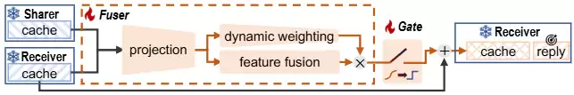 投影层:将两侧 KV 在头 / 通道维度拼接,通过线性投影与特征融合映射到统一表征空间;实现初步的信息整合;动态权重层:用输入感知的 head-modulation 对投影后的各注意力头 / 通道做自适应加权;促使模型可以判断:在何时应当保留 Receiver 的输入,何时应当增强 Sharer 的引导;可学习门控:每层有可训练门控,使用带温度退火的 Gumbel-sigmoid,从开始训练时的可微加权平滑过渡到推理时的 0/1 决策。最终以残差形式与 Receiver 原 KV 相加,保留原始表征;保证了训练的有效性以及 Receiver 输出的稳定性。这样可以自适应地将 Sharer 的信息以残差方式注入 Receiver,实现更有效的信息整合与传递。
