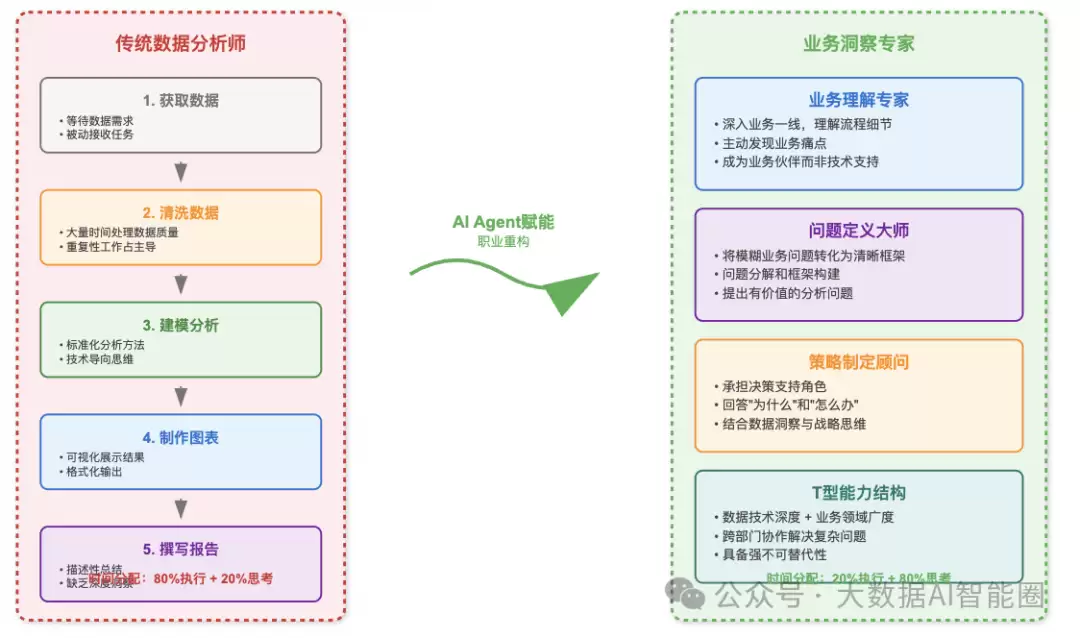 认清了AI Agent的能力边界后,我们就能更清楚地看到数据分析师职业重构的方向。这种重构不是简单的技能升级,而是整个工作模式和价值创造方式的根本性改变。