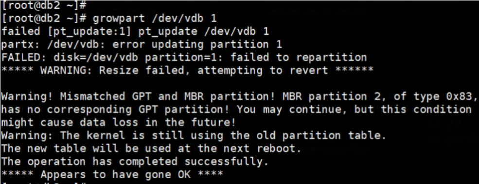 但为什么我执行growpart /dev/vdb 1会失败呢?询问用户具体情况,他似乎也不太清楚。我总结了可能的原因: