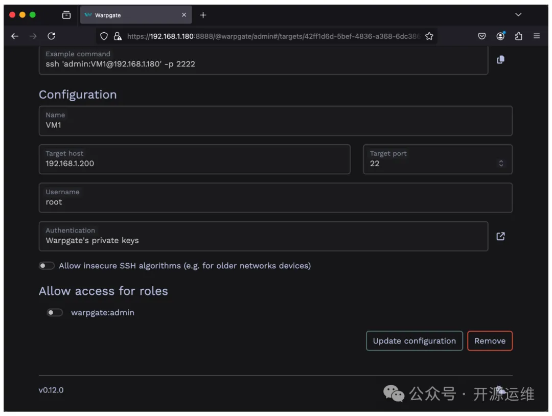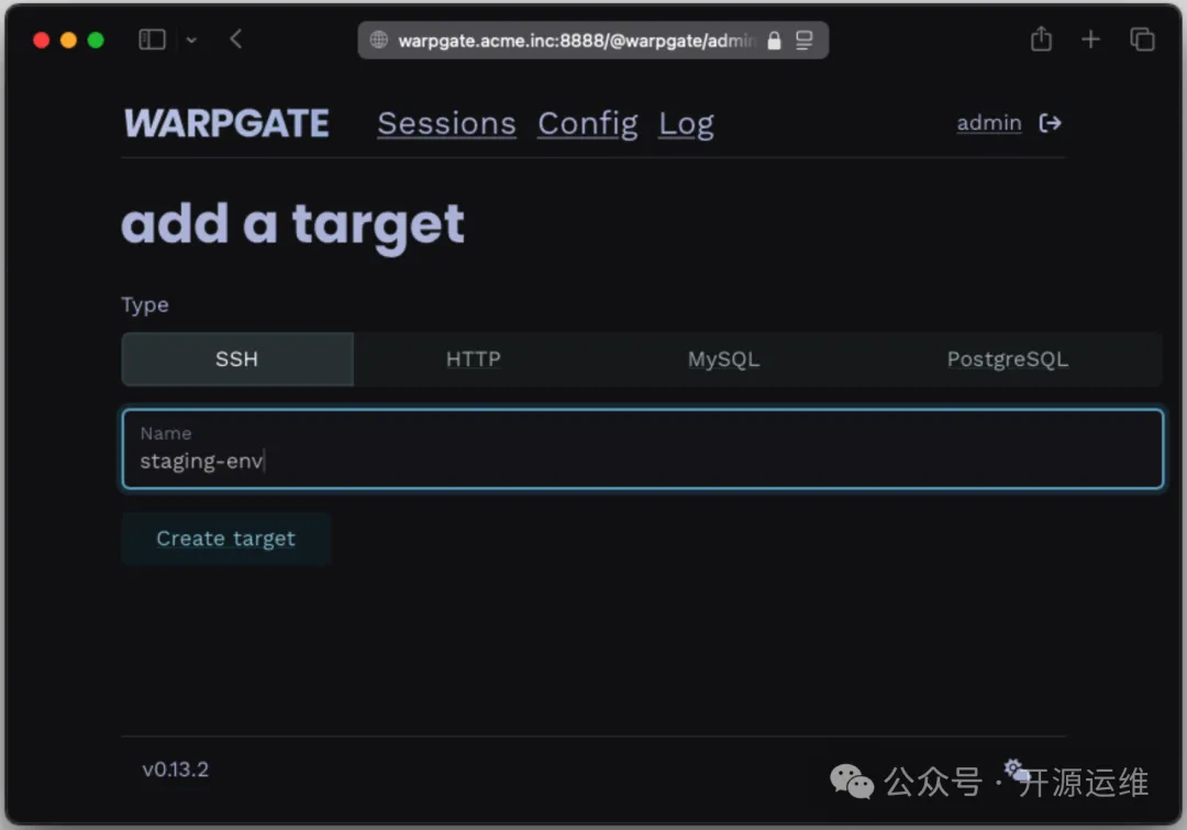 -warpgate:设置容器名称为warpgate。 -p 2222:22:将容器内部的SSH端口映射到主机的2222端口。 -p 8080:8080:将容器内部的Web界面端口映射到主机的8080端口。 -v /path/to/config:/config:将主机上的配置目录挂载到Docker容器的/config路径。通过Web管理界面进行配置。默认情况下,管理界面可以通过浏览器访问 http://localhost:8080