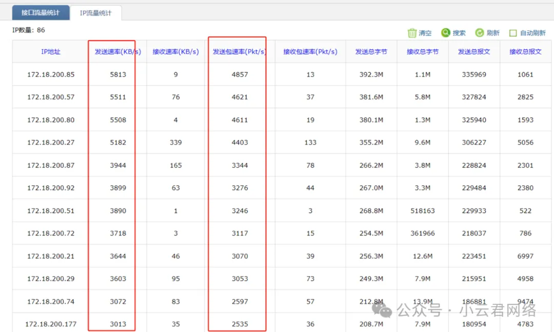 启用路由器的IP流量统计功能后,发现内网多个终端持续发送大量数据包,其发包流量稳定在30-60Mbps,发包速率高达2000-6000PPS。