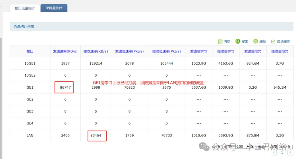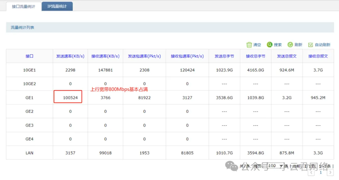 通过查看路由器接口实时速率统计,发现GE1接口的上行带宽基本处于饱和状态,且数据流均来自内网核心三层交换机。