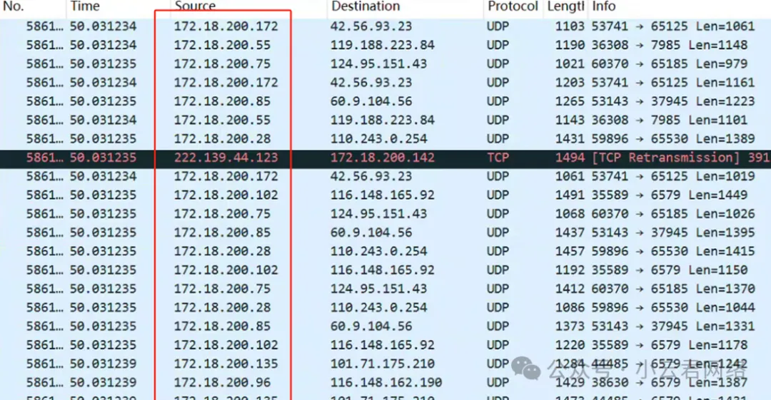报文分析显示多台设备持续向公网IP地址发送UDP数据包,这些数据包的字节长度均超过1300字节,与路由器的统计数据显示完全吻合。