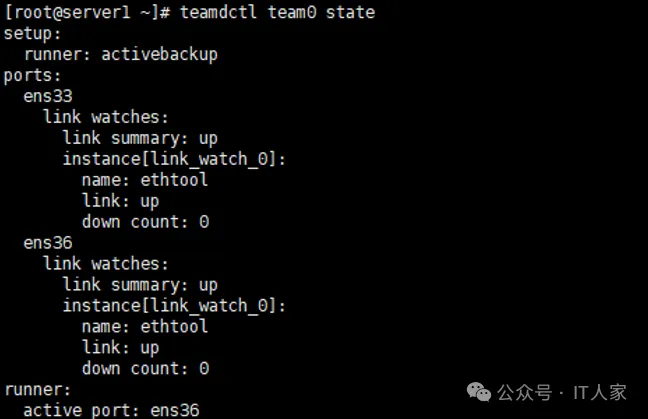 编辑配置文件:/etc/teamd/team0.conf{ "device": "team0", "runner": { "name": "activebackup" }, "link_watch": { "name": "ethtool" }, "ports": { "ens33": { "prio": -10, "sticky": true }, "ens36": { "prio": 100 } }}