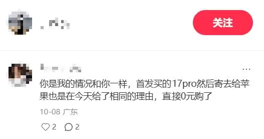另一位网友留言表示:“我的遭遇和你如出一辙,首发入手的17 Pro寄给苹果后,今天他们给出了相同的理由,最终折抵金额直接变成了0元。”