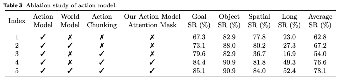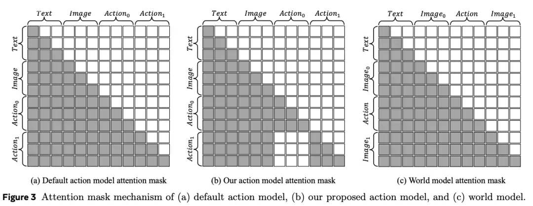这种注意力机制设计使自回归框架能够并行生成多个动作,而世界模型组件则继续遵循传统的因果注意力掩码,如图(c)所示。