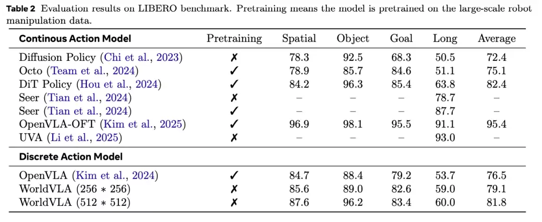 如下表数据所示,即便在没有进行预训练的情况下,WorldVLA模型也展现出优于离散化OpenVLA模型的性能水平,这充分证明了其架构设计的先进性与有效性。