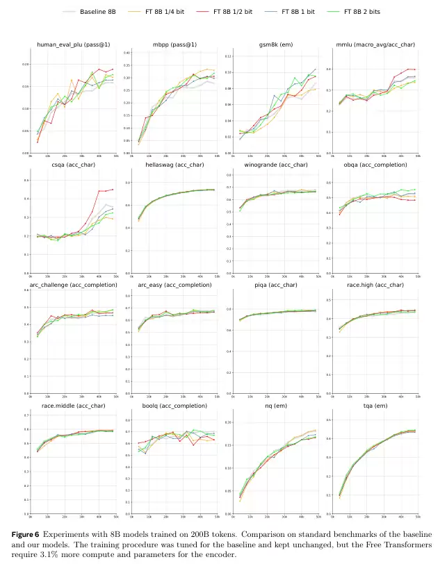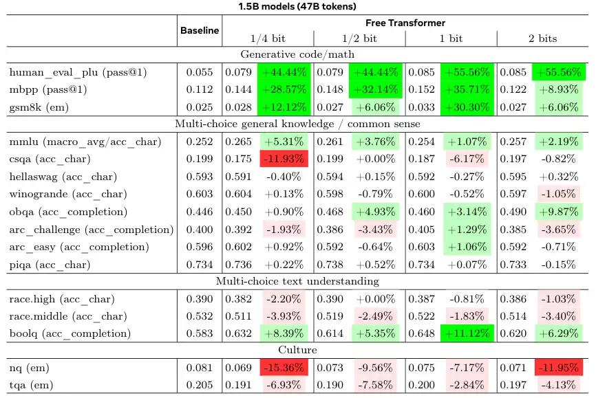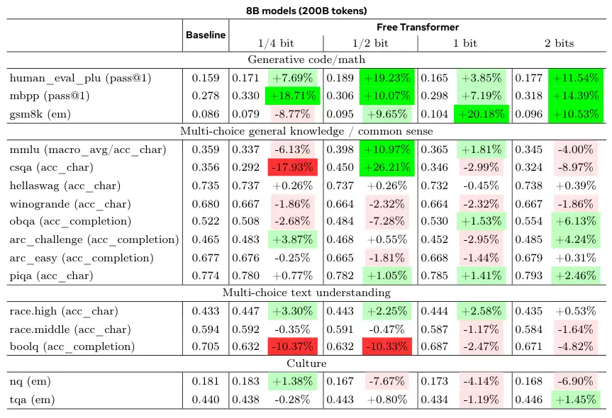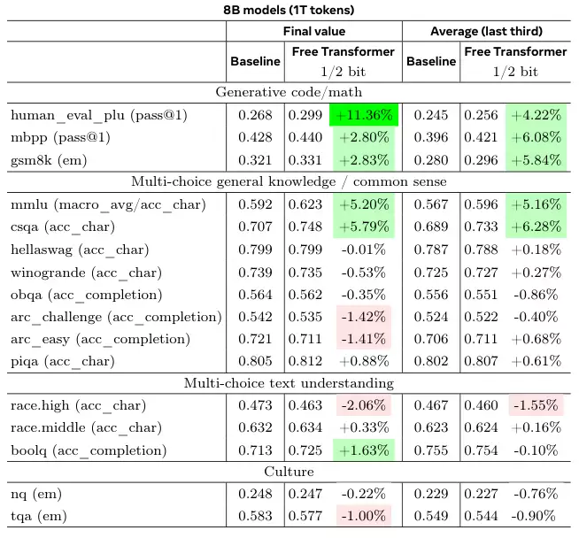 结果显示,在需要推理能力的基准任务上,如HumanEval+(代码生成)、MBPP(代码生成)和GSM8K(小学数学应用题),Free Transformer都取得了显著的性能提升。