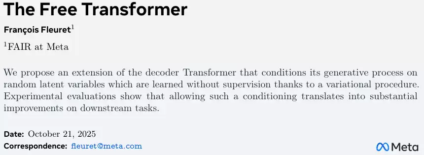 来自Meta FAIR部门的研究员François Fleuret发布了一篇题为《The Free Transformer》的论文,提出了一种对现有解码器Transformer模型的巧妙扩展。