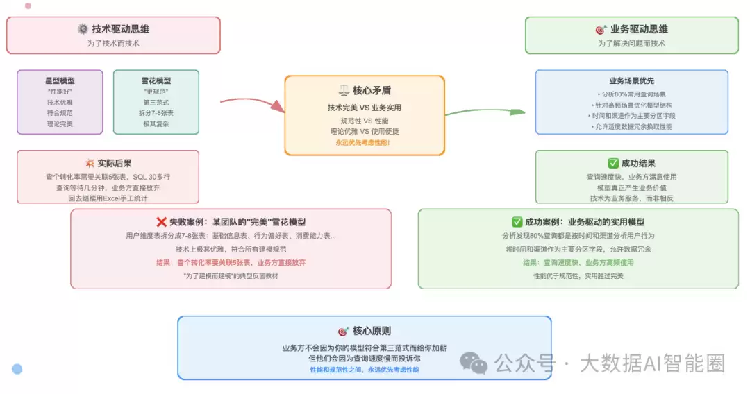 我见过一个团队,为了追求所谓的"完美的数据模型",设计了一套极其复杂的雪花模型。用户维度表被拆分成基础信息表、行为偏好表、消费能力表等七八张表。技术上的确很优雅,符合所有的建模规范。