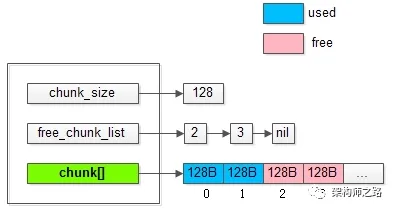 会从最接近item大小的slab的chunk[]中,通过free_chunk_list快速找到对应的chunk。如上图所示,与item大小最接近的chunk是128B。