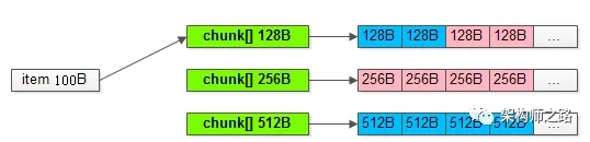 如上图所示,一系列slab分别管理128B、256B、512B等不同尺寸的chunk内存单元。