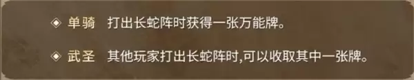 当关羽打出"长蛇阵"(连续点数牌型)时,犹如青龙偃月刀破敌之势,可获得一张"万能牌"(可替代除龙凤牌外的任意牌);若其他玩家打出长蛇阵牌型,关羽还能从中抽取一张加入自己的手牌。