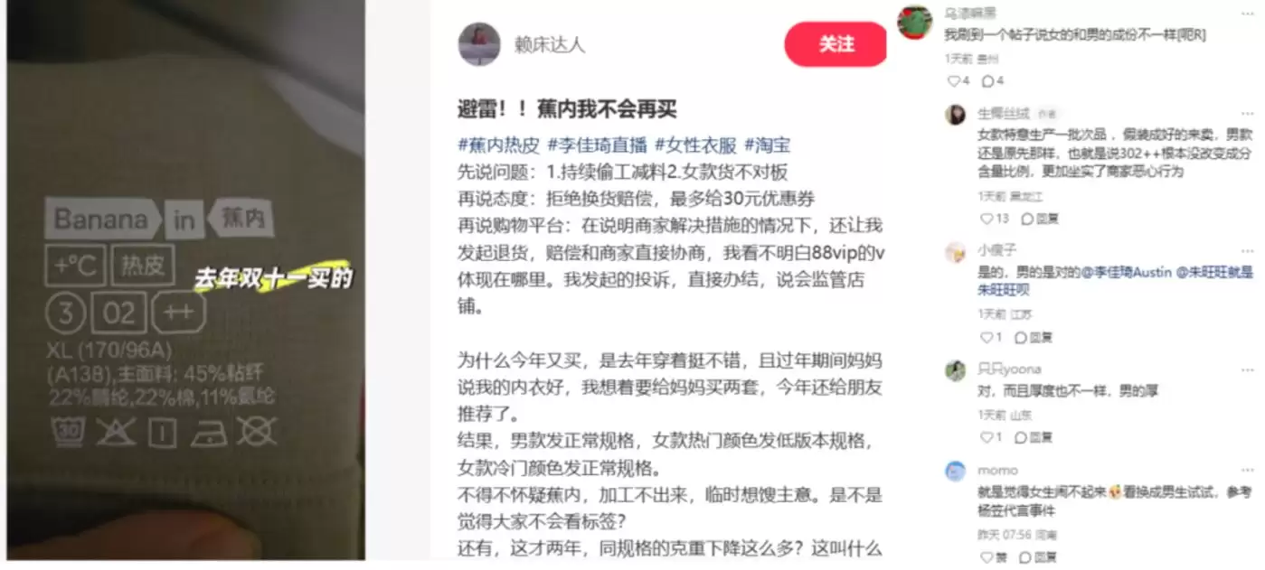 更为关键的是,引发争议的产品并非强调款式、时尚的外搭单品,而是款式高度相似、功能诉求极为单一的基础保暖内衣。在这一品类中出现明显的品质差异,迅速触动了消费者对于公平的敏感神经。