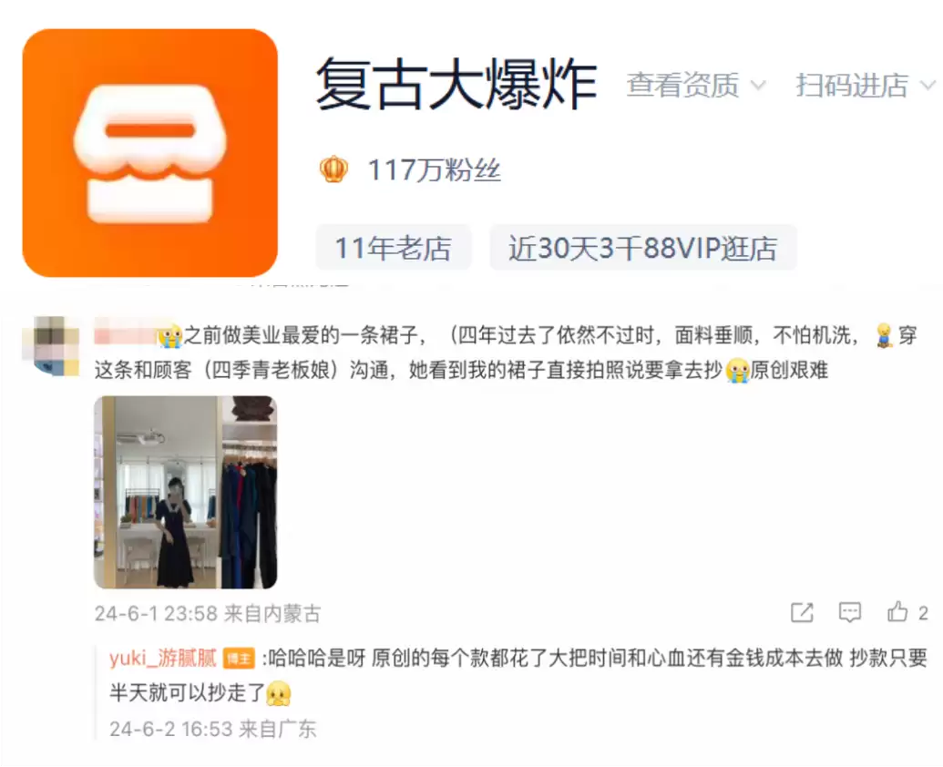 正像2024年,坐拥117万粉丝、11年老店的复古大爆炸宣布闭店,创始人提及行业内抄袭乱象。即便创新品牌推出高质量单品,也难以在抄袭者低价竞争下建立品牌溢价,陷入恶性竞争。