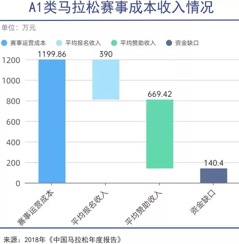 根据《中国马拉松年度报告(2018)》的数据,以A1级赛事为例,平均运营成本约1199.86万元,即便算上报名费和赞助收入,仍有100多万元的资金缺口需要依靠政府补贴来填补。