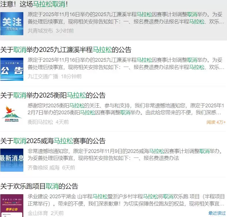 曾几何时,马拉松赛事站在全民健身的流量巅峰,如今却不得不面对"降温"的现实。仅10月以来,全国已有百余场马拉松发布赛事调整通知——有的直接取消,有的缩减项目规模,还有的宣布延期举办。